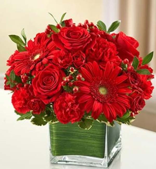 A symbol of courage and strength, an all-red bouquet conveys your sympathies with striking beauty. Our florists fill a stylish cube vase with roses, spray roses, Gerberas, carnations and more to send a fitting tribute during times of sorrow.
