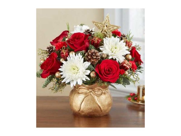 The joy of gift-giving comes alive in our bright and festive new arrangement. We’ve gathered red & white blooms, mini presents and glittery gold accents in our exclusive Santa’s sack container, dusted in gold and featuring an embossed burlap design. Full of vintage charm, it’s a gift that delivers the magic of the season.